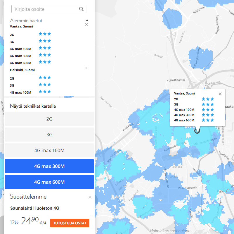 Tässä on kuvankaappaus Elisan kuuluvuuskartasta Vantaan alueelta. Vantaalla Elisa ei ole tehnyt vielä päivityksiä tukisemiin ja ilmoittaa kuitenkin mobiiliverkolle maksiminopeudeksi 600Mbit/s. Tämä ei siis ole mahdollista edes labraympäristössä vaan nopeus tulee olemaan lähes aina alle 400Mbit/s käytännössä. Tällä hetkellä merkinnät kartassa menee niin että 600Mbit/s  alueet ovat 3:lla taajuudella olevia tukiasemia ja 300M merkinnällä kahdella taajuudella olevat tukiasemat.