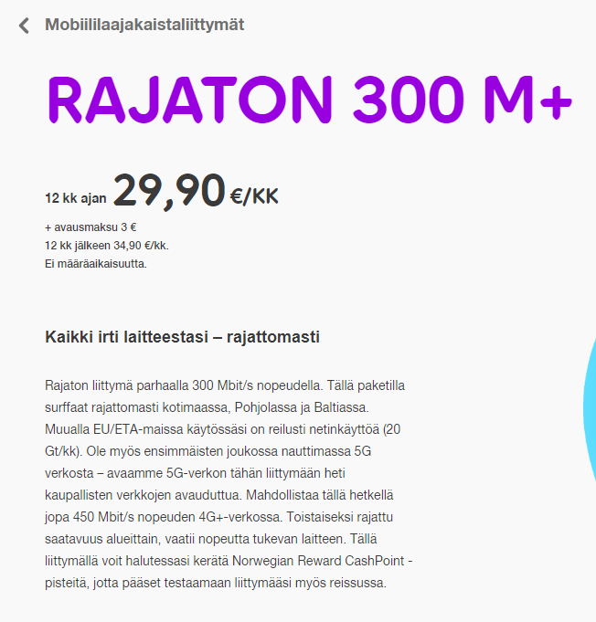 Teleoperaattori Telialla tuli viimeisenä 5G-valmiudessa oleva liittymä nimellä RAJATON 300M+ , jolle luvataan maksiminopeutta 450Mbit/s asti ja pääsyn 5G-verkkoon kun tämä otetaan käyttöön. Sentään Telia vielä mainostaa 300M+ nopeutena, vaikka liittymällä mahdollista saada suurempia nopeuksia.