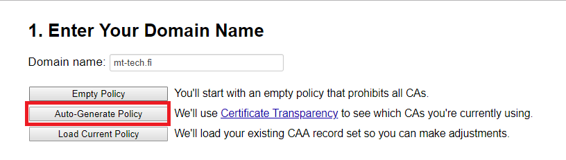 Syötä lomakkeeseen verkkotunnus ja käytetään automaatista säännön luojaa. Tämä hakee Certificate Transparency tiedoista automaattisesti varmennemyöntäjäsi tiedot.
