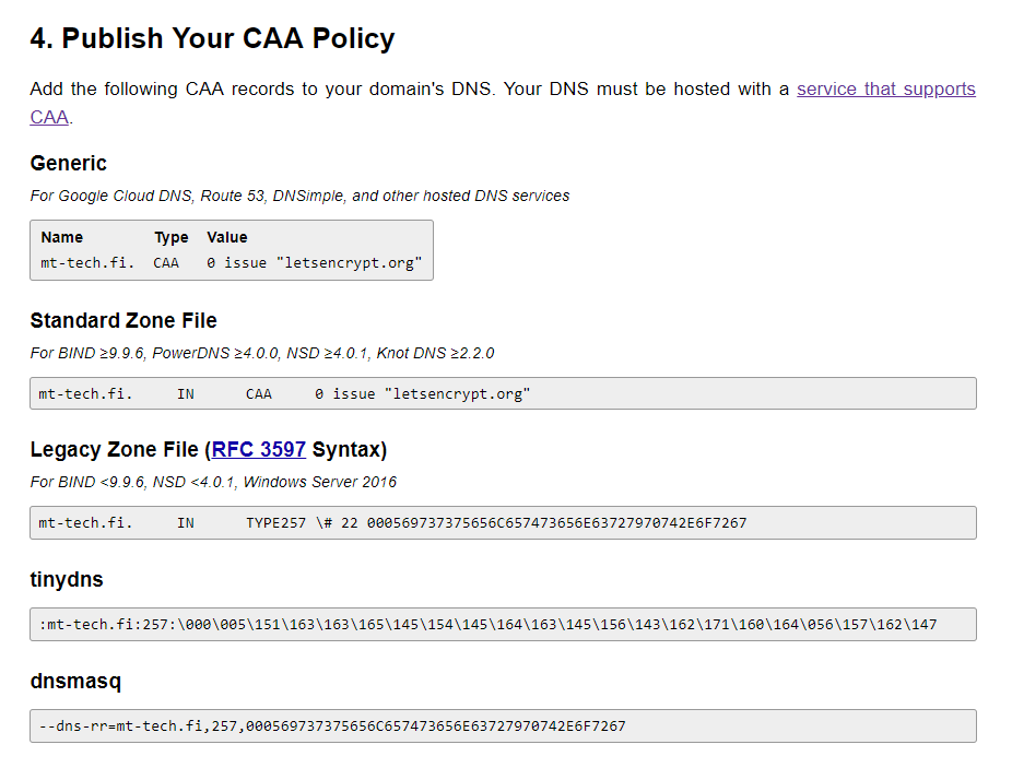 CAA:n käyttö vaatii että oma nimipalvelin ja palveluntarjoaja tätä tukee. Voit tarkistaa tämän SSLMaten sivuilla. SSLMaten sivuilla on kätevä työkalu tämän nimipalvelintietueen luomiseksi.