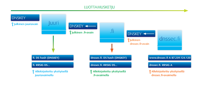 - Nyt kysellään fi-juuripalvelimelta missä löytyy dnssec.fi nimipalvelin. Koska fi-juurellakin on DNSSEC-käytössä, niin Internet-yhteyden tarjoajan nimipalvelin varmistaa DNSSEC-allekirjoituksen että se täsmää juuren merkityn kanssa.