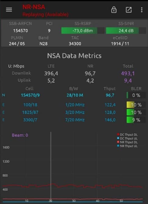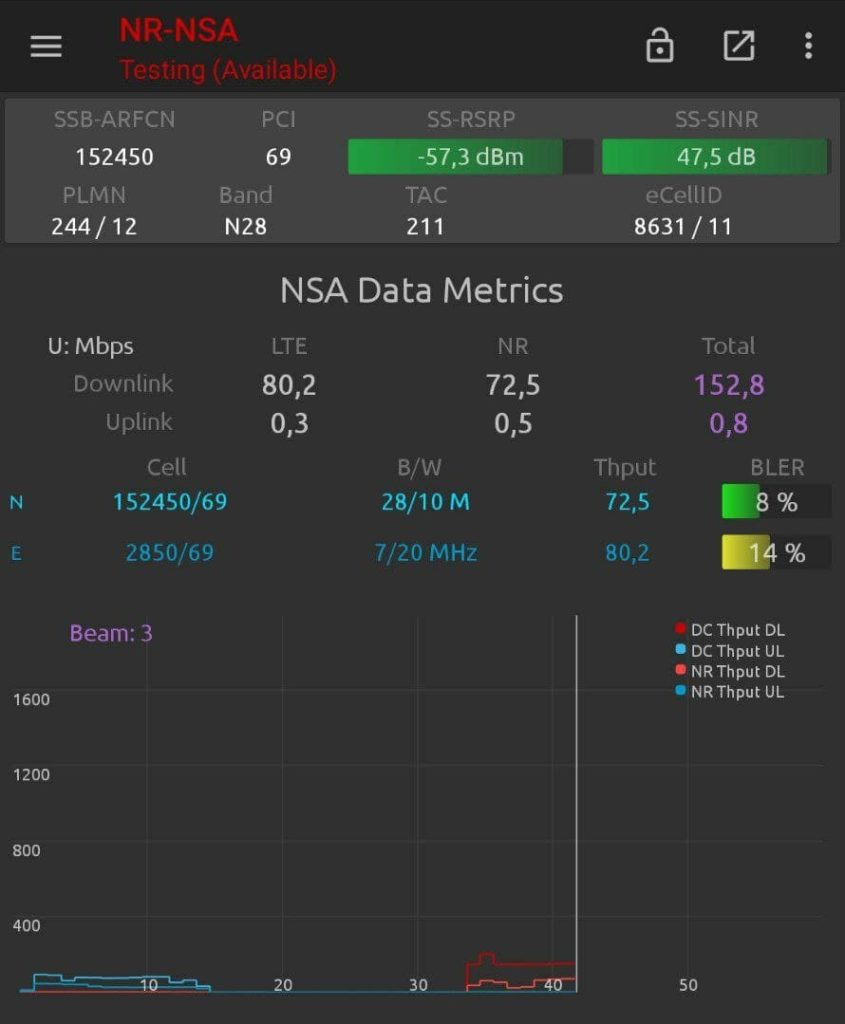 4G:n maksiminopeus ~ 97 Mbit/s 256QAM 2×2 MIMO:lla ja 5G:n maksiminopeus ~102 Mbit/s eli hieman nopeampi 5G voisi olla riippuen konfiguraatiossa. Huomaathan että DSS:ää käyttäessä maksiminopeus on alempi johtuen DSS:stä. Tällä hetkellä mahdoton sanoa virrankulutuksesta erityisesti parannusta kun 5G NSA:ssa tarvitaan vielä 4G:tä ankkuritaajuudeksi. Virrankulutus varmasti paranee uudempien päätelaitteiden kanssa.
