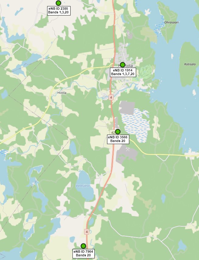 Lahdesta päin saavuttaessa kahdessa ensimmäisessä tukiasemassa ei ollut muita 4G-taajuuksia käytössä kuin B20 (800 MHz) 700 MHz 5G:n (n28) lisäksi.