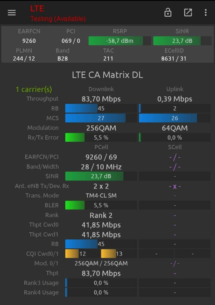 Päätelaitetuki B20+n28-yhdistelmälle (800 MHz 4G + 700 MHz 5G) on hyvin suppea, joten emme saaneet Hartolan eteläpuolella Oneplus 8 -puhelimella n28 taajuusaluetta aktivoitumaan, koska mitään muuta LTE-ankkuritaajuutta ei kuulunut kuin B20 (800 MHz). Signaloinnin perusteella 700 MHz 5G (n28) kuitenkin löytyi myös 800 MHz (B20) tukiasemista ja verkko myös pyysi päätelaitetta kertomaan taajuustuestaan.