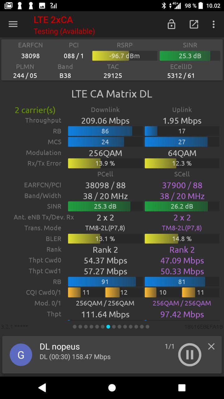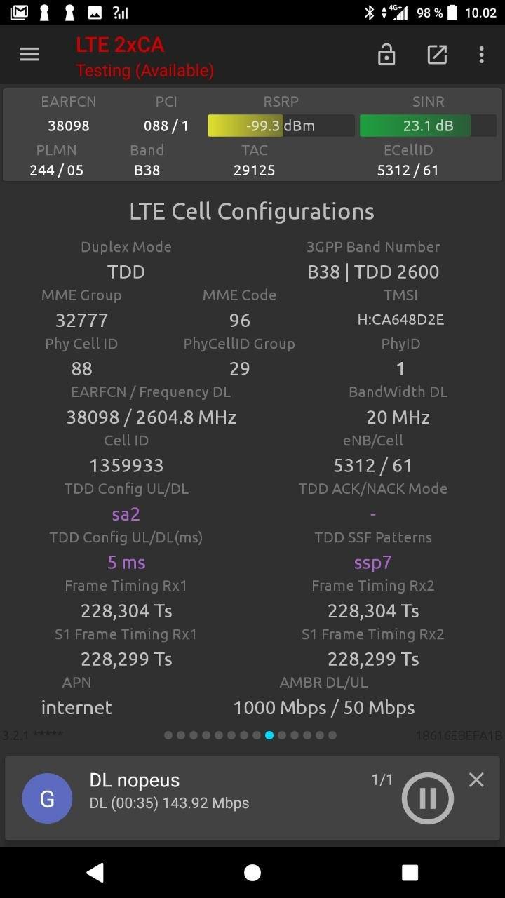 NSG-testisovelluksella nähtiin Elisan käyttävän kahta B38 20 MHz kaistaa siten, että 2CA niiden välillä oli mahdollinen. Myös FDD-TDD-kombinaatiot, kuten B3+B38 ja B7+B38 olivat mahdollisia päätelaitteiden tukemien taajuusyhdistelmien mukaisesti. Nopeus TDD:llä oli kuitenkin huomattavasti matalampi kuin FDD:llä on totuttu näkemään kuvakaappauksen kaltaisesti kuormitetussa LTE-verkossa (RB-määrä). On kuitenkin otettava huomioon, että resurssiblokkien määrä ei aina ole luotettava käyttäjämäärän mittari, sillä tukiasema saattaa jakaa ja osoittaa päätelaitteelle resursseja monilla eri tavoilla. Jostain syystä Keravan rautatieaseman suuntaan palveleva tukiasemasektori oli kaikista nopein. Jopa rautatieaseman laiturialueella oli saatavissa erittäin hyviä TDD-nopeuksia. Avoimeksi jäi säteenmuodostuksen merkitys yhteyden laatuun.