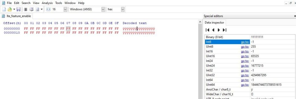Change all values to 11111111 (FF) to enable all LTE-features what chipset support. Here is explanations of all Feature bits.