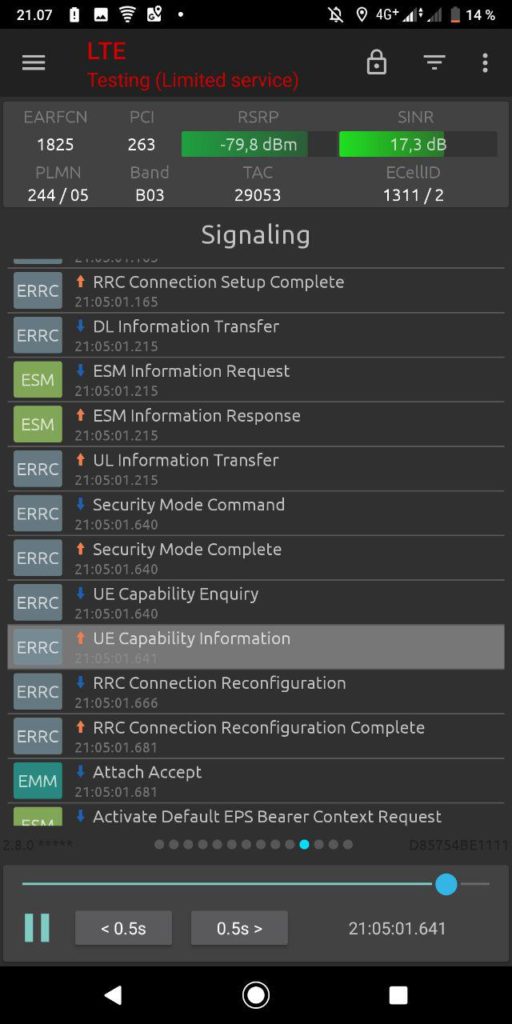 To see UE Capability Information message, you have to open Cellular-Pro first, then put your phone to Airplane mode on and then off. Wait some time when you phone connect back to network and you should see UE Capability Information message (screenshot below). With 5G-devices you can also see 5G Capability in UE MRDC Capability message.