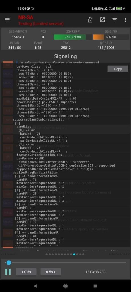 You can check two different ways: 0xB826 and UE Capability Information message. In UE Capability Information if use our test cap_prune on Xiaomi, the device respond to n28 and n78 band NR band request example on 5G n28AA-n78A, but not n78AA because it missing in cap_prune file because we on this test we tested NR-CA (article in Finnish).