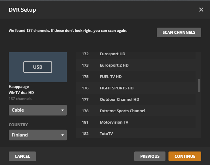 DNA KaapeliTV-verkosta löytyi helposti 137 TV-kanavaa, mutta tällä TV-virittimellä voidaan katsoa vain salaamattomia kanavia. Valitaan Continue päästääkseen asennusvelho loppuun asti.