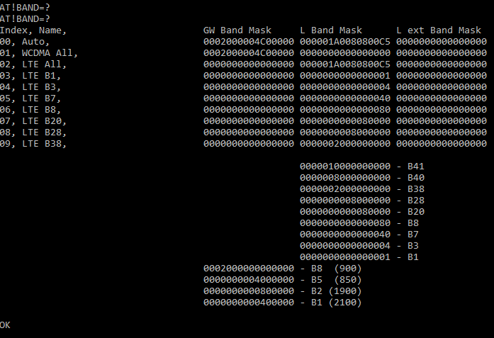 Toimii niin MR2100 kuin MR5200 purkeille, USB kaapelilla pitää olla kiinni ja tetherin päällä. MR2100 pitää laittaa AT komennon jälkeen välilyönti. Myöskin sellainen mahdollisuus, että tiputtaa 800Mhz taajudet pois ja jättää nopeammat onnistuu seuraavasti: AT !BAND=03,”4G”,0,3A0000000C5,0