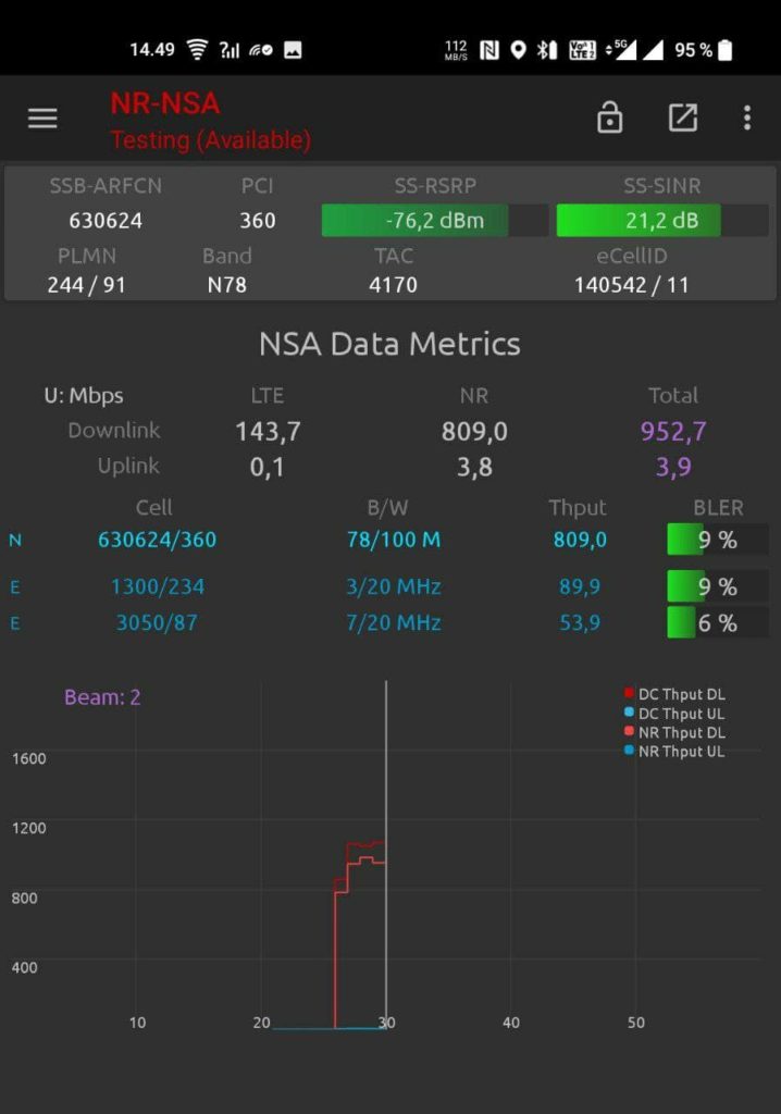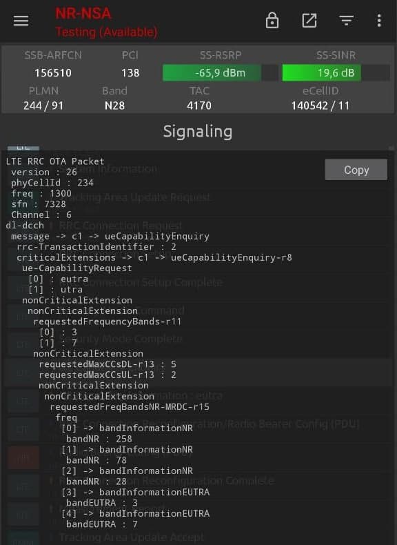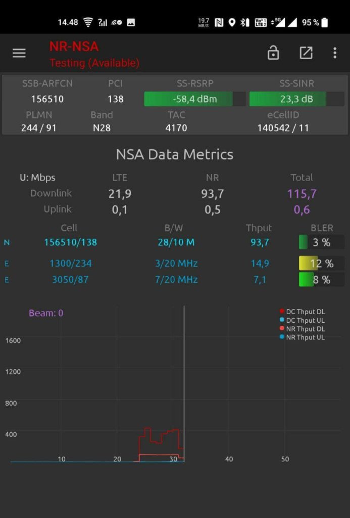 Käyttämäni päätelaite OnePlus 8 ei tue kuin n78 (3,5 GHz) Suomessa, mutta muokkaamalla modeemin konfiguraatiota sain toimimaan myös n28-taajuuden (700 MHz). Samassa Mellunmäen tukiasemassa on myös B1 (2100 MHz) ja B20 (800 MHz)-taajuudet, mutta erikoisesti tukiasema ei kysy näitä taajuuksia UE Capability Enquiry -viestissä. Tämä aiheuttaa sen, ettei useilla päätelaitteilla toimi Carrier Aggregation ja Dual Connectivity, mikäli päätelaite joutuu B1 tai B20 -taajuudelle.