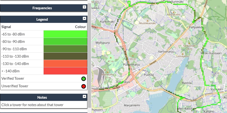 Päivitetyt 4G-tukiasemat CellMapperin kartalla.
