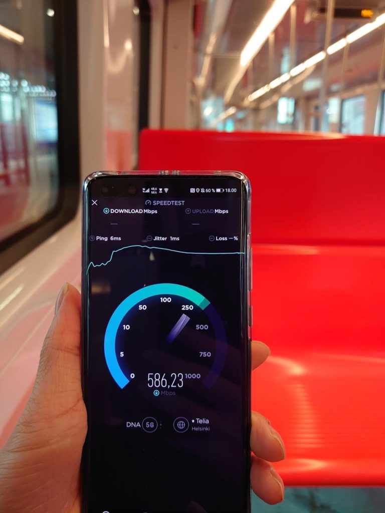 Kokeilimme lisäksi Myllypuron metroasemalla metrojunan sisällä 5G:n toimivuutta. Paikallaan olevassa metrojunassa päästiin 500-600 Mbps latausnopeuteen. Kokeilimme myös 5G:tä liikkuvassa paikallisliikenteen linja-autossa mitaten nopeutta toistuvasti. Koko mittauslenkillä signaalinvoimakkuus oli hyvä ja latausnopeus oli noin 500Mbps tasolla. Tällä hetkellä 5G-verkossa ei todennäköisesti ole paljoakaan käyttäjiä, joten nopeudessa sekä toimivuudessa voi tulevaisuudessa tulla enemmän vaihteluita. Testien perusteella voimme todeta DNA:n 5G:n toimivan luotettavasti Huawei P40 Pro:lla myös liikkuvassa ajoneuvossa. Käytettävissä päätelaitteissa on merkittäviä eroja eri merkkien ja mallien välillä, joten 5G-päätelaitteen valinnassa kannattaakin olla tarkkana.