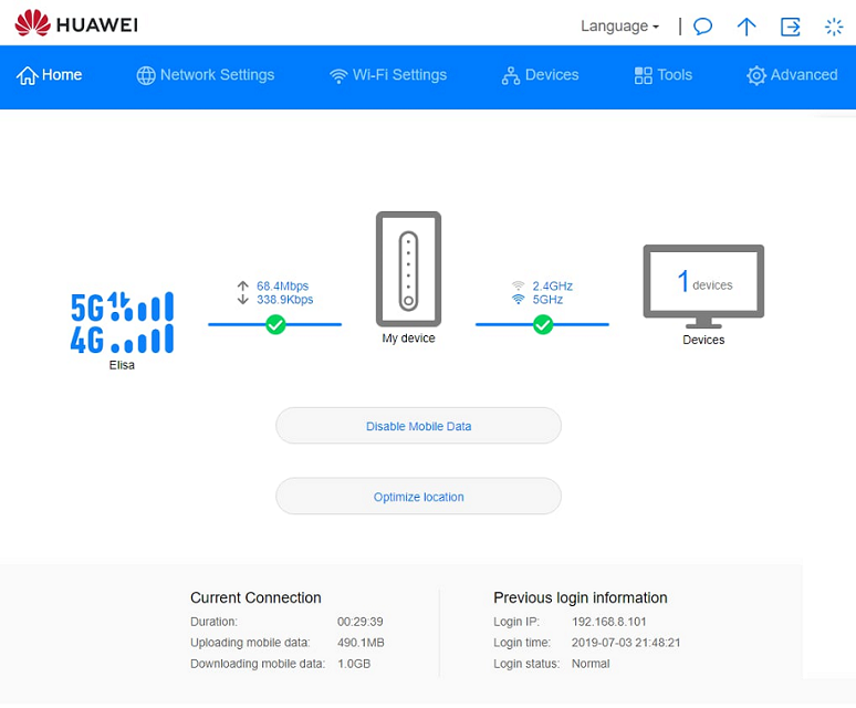 Huawein hallintanäkymän käyttö on helppoa ja nopeaa, koska käyttöliittymä on moderni ja selkeä. Huawein LTE Watch-ohjelma ei toimi laitteen kanssa, mutta selaimella voi tutkia api-rajapinnan kautta signaali- ja verkkotietoja osoitteessa 192.168.8.1/api/device/signal/