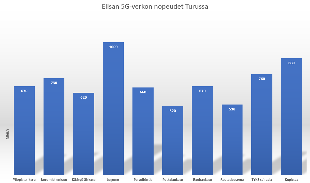 Kenttätestit suoritettiin Turussa ja Kupittaalla yhden päivän aikana ajamalla autolla ympäri kaupunkia, jolloin saavutettiin kerran 1 Gbit/s nopeus Logomon alueella. Täysiä nopeuksia on harvoin mahdollista saada, mutta testi osoittaa kuitenkin sen, että 5G-verkko tuo jo nyt ensimmäisessä vaiheessa selvästi suurempia keskinopeuksia kuin 4G-verkko.