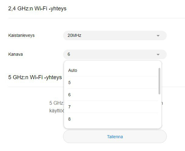 Jostain syystä Huaweissa ei voi valita 1-4 kanavia 2.4 GHz Wifissä, joka on hyvin erikoinen puute. Tavallisesti 2.4 GHz Wifi-kanavista pitäisi käyttää vain kanavia 1, 6 ja 11, jotta ne eivät mene päällekkäin. Huawein automaattitoiminto valitsi kuitenkin välikanavia, joten jos tarve on 2.4 GHz Wifille on käyttäjän syytä valita kanava manuaalisesti. 5 GHz Wifi osoittautui huomattavasti nopeammaksi kuin 2.4 GHz Wifi. 5 GHz Wifi on yleensä ruuhkaton ja se onkin suositeltavin vaihtoehto mikäli kantama vain riittää käyttöpaikassa.