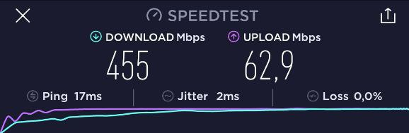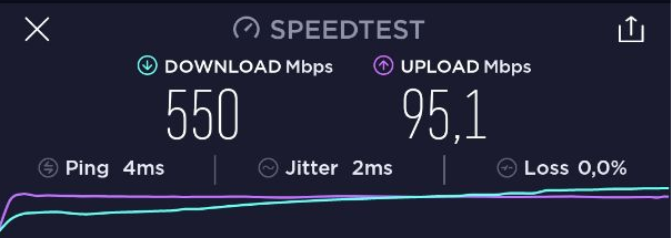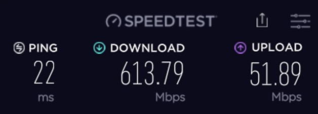 Testasimme myös 4G-nopeuksia kannettavalla tietokoneella, joka oli kytkettynä 1Gbps ethernet-liitännällä 4G-modeemiin. Huawei vakuutti suorituskyvyllään ja saimme nopeustesteissä parhaimmillaan yli 600 Mbps latausnopeuksia Elisan 4G-verkossa. Tukiasemassa oli käytössä B1 (2100 MHz) + B3 (1800 MHz) + B7 (2600 MHz) 4×4 MIMO sekä B20 (800 MHz) ja B28 (700 MHz) 2×2 MIMO.