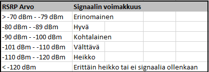 Alla olevassa taulukossa on kuvattu tarkemmin signaalin voimakkuustason (RSRP) merkitys. Laatuarviot ovat suuntaa-antavia.