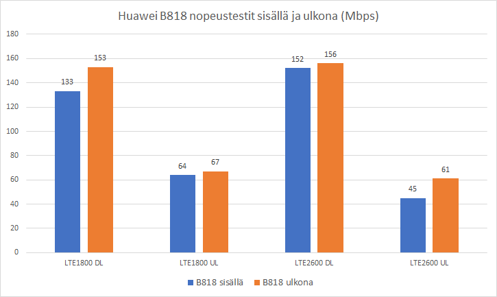 Sisä- ja ulkotilojen signaalin voimakkuudessa oli merkittäviä eroja. Rakennus vaimensi jopa 20 dBm 1800 MHz signaalia Huawei B818:lle. Koska ulkona tukiasemaan oli suora näköyhteys ja signaalin voimakkuus oli erinomainen niin vaimentuma sisällä ei vaikuttanut kovin paljoa nopeuksiin. Tämä on kuitenkin syytä huomioida omassa käyttöpaikassa, koska jos signaalitaso on esimerkiksi parvekkeella -90 dBm niin sisätiloissa signaali voi olla jo