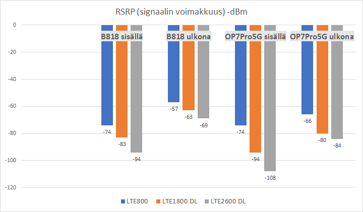 Vertailimme signaalin voimakkuutta (RSRP) Huawei B818:lla ja OnePlus 7 Pro 5G puhelimella Elisan 4G-verkossa eri taajuuksilla sisällä ja ulkona. Testipaikkana toimi muutaman vuoden vanha kivitalo, joka on rakennettu energiatehokkaaksi. Sisätiloissa signaalin voimakkuus mitattiin tv-tason päällä olohuoneen nurkassa, joka on tukiaseman suuntaan. Ulkona testaus suoritettiin terassilla, joka on olohuoneen edessä ja josta on suora näköyhteys tukiasemaan. Signaalin voimakkuudessa pienempi negatiivinen luku on parempi.