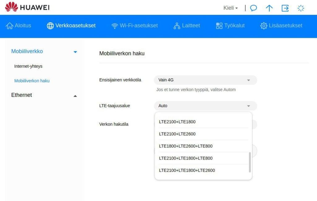 Olisiko tietoa, millä logiikalla LTE-taajuuslukitus toimii. Minulla on nyt lukittu LTE1800+LTE800 (alueella molemmat)? Reititin näyttäisi valitsevan aina tuon ensimmäisen taajuuden, vaikka välillä LTE800 olisikin kapasiteeetiltaan parempi. Eli mikä idea tuossa usean taajuuden lukituksessa oikeasti on? Toinen ihmettelun aihe, eikö näihin Huawein reitittimiin tule ohjelmistopäivityksiä/-korjauksia? Reikiä niiden softeissa on – kuten kaikissa.