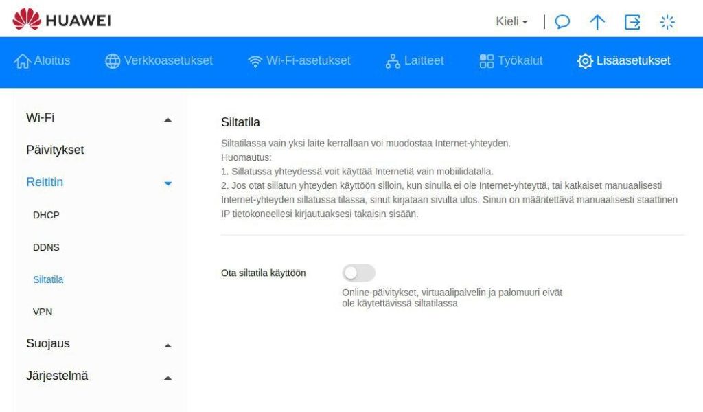 Tässä Huawei-laitteesta löytyy monipuolisesti ominaisuuksia, kuten siltaus, taajuuslukko / taajuusyhdistelmä-lukko, porttiohjaukset ja DMZ.