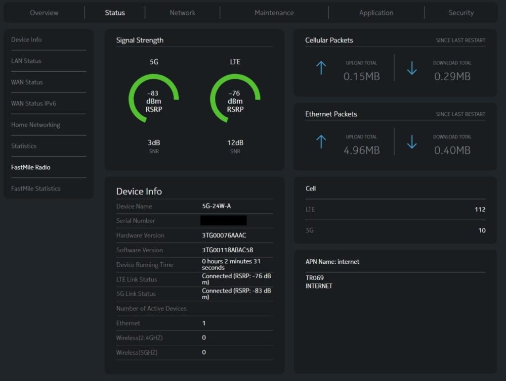 FastMile 5G tarjoaa kattavat tiedot hallintapanelissa, jonka avulla voi seurata kuinka hyvä signaali laitteella on tukiasemaan. Taajuuslukkoa laitteessa ei ole ja muutenkin toiminnot ovat suppeahkot. Esimerkiksi DMZ/porttiohjaukset puuttuvat laitteesta käytettäessä mobiiliverkkoa.