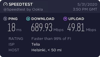 Teimme nopeustestejä muutaman eri tukiaseman alueella Itä-Vantaalla. Telian verkkoa laajennetaan koko ajan 5G:n osalta, joten uusia 5G-tukiasemia tulee lähes viikottain. Tästä huolimatta Telian 5G-peitto on vielä hyvin hajanaista ja pienillä alueilla, joten testit jouduttiin suorittamaan autossa. Tyypilliset nopeudet olivat 550-750 Mbit/s luokkkaa FastMilella. Verrokkina käytetty Oneplus 7 Pro 5G ja OnePlus 8 puhelimet saivat suunnilleen samanlaisia tuloksia.