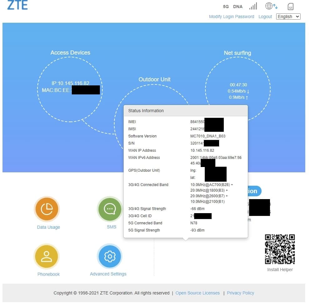 ZTE:n sovelluksen avulla tärkeintä on varmistaa, että RSRP arvo (signaalin voimakkuus) olisi suurempi kuin -100 dB. SINR-arvo kertoo häiriötason ja sen olisi hyvä olla vähintään 10 dB, mutta mieluiten 15-30 dB välillä, jolloin saat mahdollisimman nopean yhteyden luotua laitteen ja tukiaseman välille. Aikaisemmassa artikkelissamme on kerrottu tarkemmin signaaliarvoista ja niiden vaikutuksesta nopeuksiin.