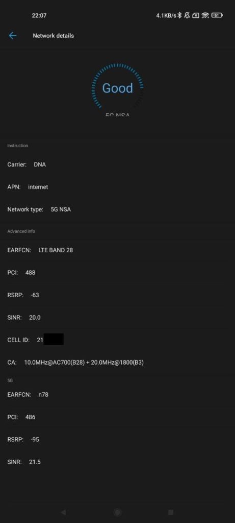 5G SA-tuki löytyy DNA:n laitteella MC7010_DNA1_B03 firmware-versiossa käytettäessä Elisan tai DNA:n verkkoa.