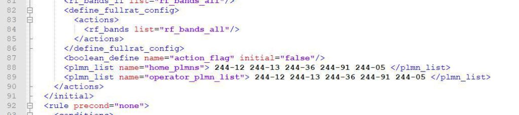 Lisää carrier_policy.xml tiedostoon riville 88 ja 89 ”244-91 244-05” jotka ovat Telian ja Elisan MCC-MNC-tunnistetiedot. Näin konfiguraatio määrittää nämä kotiverkoiksi.  Tallenna tämä takaisin puhelimen modemiin ja käynnistä puhelin uusiksi ottaaksesi käyttöön tämän konfiguraation.